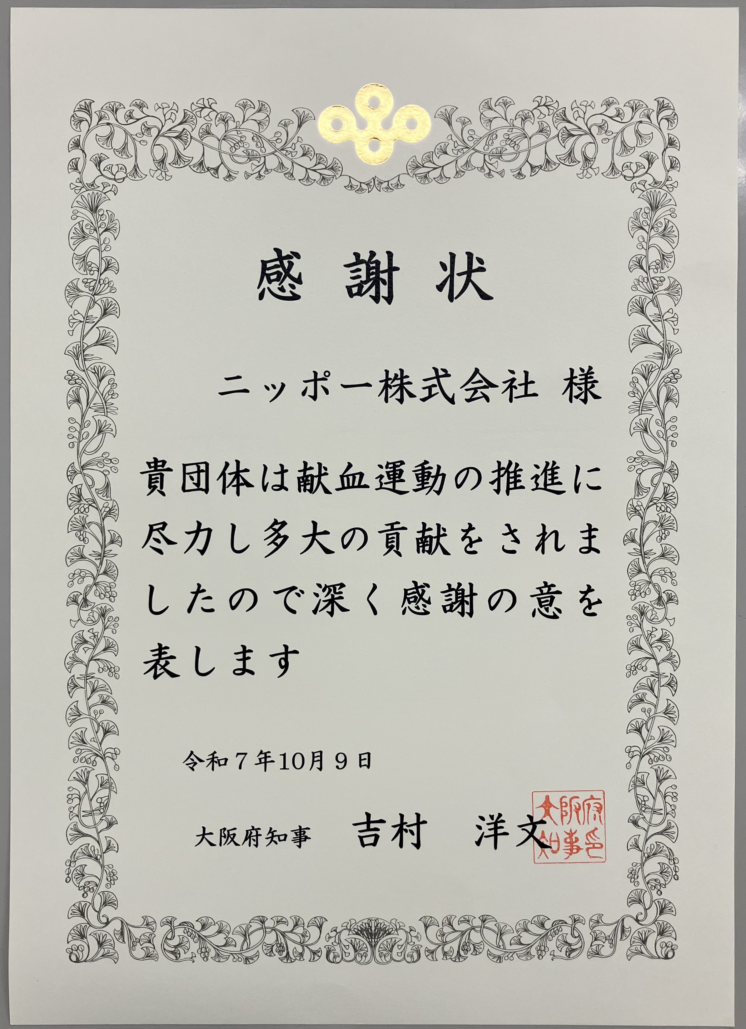この度、大阪府知事より献血活動に対する感謝状をいただきました。